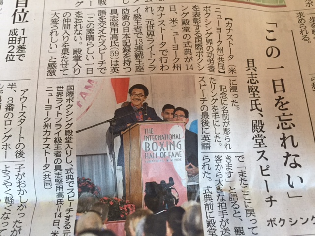 国際ボクシング殿堂の式典で英語を交えながらスピーチをした。というものです。